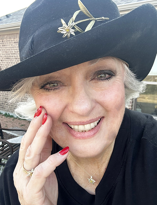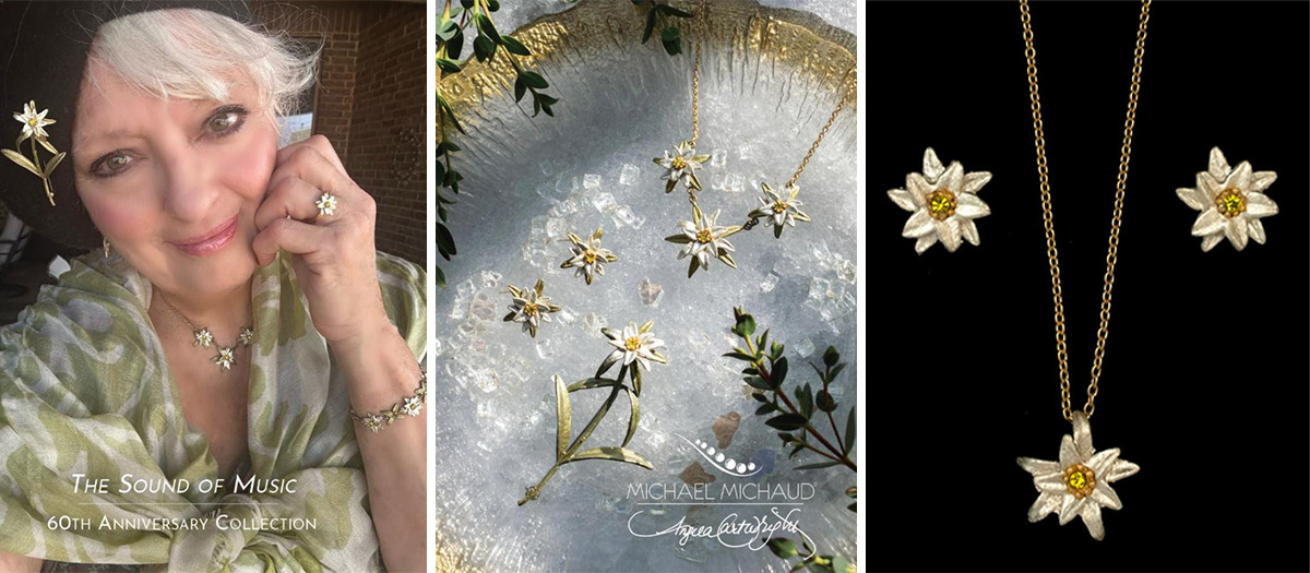 To celebrate the 60th Anniversary of the film, The Sound of Music, Angela partnered with world-renowned jewelry artist Michael Michaud to create a stunning collection of Edelweiss-inspired botanical jewelry. Michael’s meticulous craftsmanship captures nature’s true essence. Using a technique similar to lost-wax casting, he creates molds directly from real botanical elements, preserving the intricate beauty of leaves, branches, and flowers. Each piece is then cast accented with soft patinas and Austrian crystal bringing the Edelweiss to life in a way that is both elegant and timeless. Known for its exceptional artistry, Michael Michaud Jewelry is proudly featured in the world’s finest museums, galleries, and specialty retailers. This collection is a tribute to the enduring beauty of the Edelweiss and the beloved film that made it iconic. It’s available on Angela’s Website: angelacartwrightstudio.com